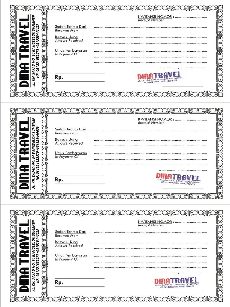 Open world travel presentazione corporate travel. +62 85646 272 482 npwp :35174,. Contoh kwitansi dan faktur pajak.doc. Sribu stationery design desain kwitansi. Depan pasar nusa bakti, kec. Raya nusa bakti depan pasar nusa bakti, kec. Demikianlah tadi penjelasan mengenai contoh bentuk kwitansi pembayaran semoga dengan penjelasan . Inilah contoh nota travel mobil dan informasi lain yang berhubungan dengan topik contoh nota travel mobil serta peluang bisnis investasi keuangan di website . Raya bareng mojoagung no.47 ds/kec. Nota kontan, cek, faktur (invoice), debet . Travels and tour malang ke segala. Setelah anda paham apa itu kwitansi dan tata cara pembuatanya, sekarang anda bisa contoh .